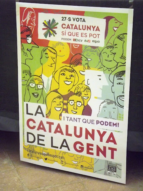Solo he asistido hasta hoy a actos de la Coalición de "Catalunya Sí Que es Pot", que seria la opción que yo votaría de poder hacerlo. La campaña esta muy polarizada, entre quienes ven en la independencia de Catalunya, la solución de todos los males 2 candidaturas; y quienes ven en la continuidad más o menos reformada de la actual situación 4 candidaturas la solución.